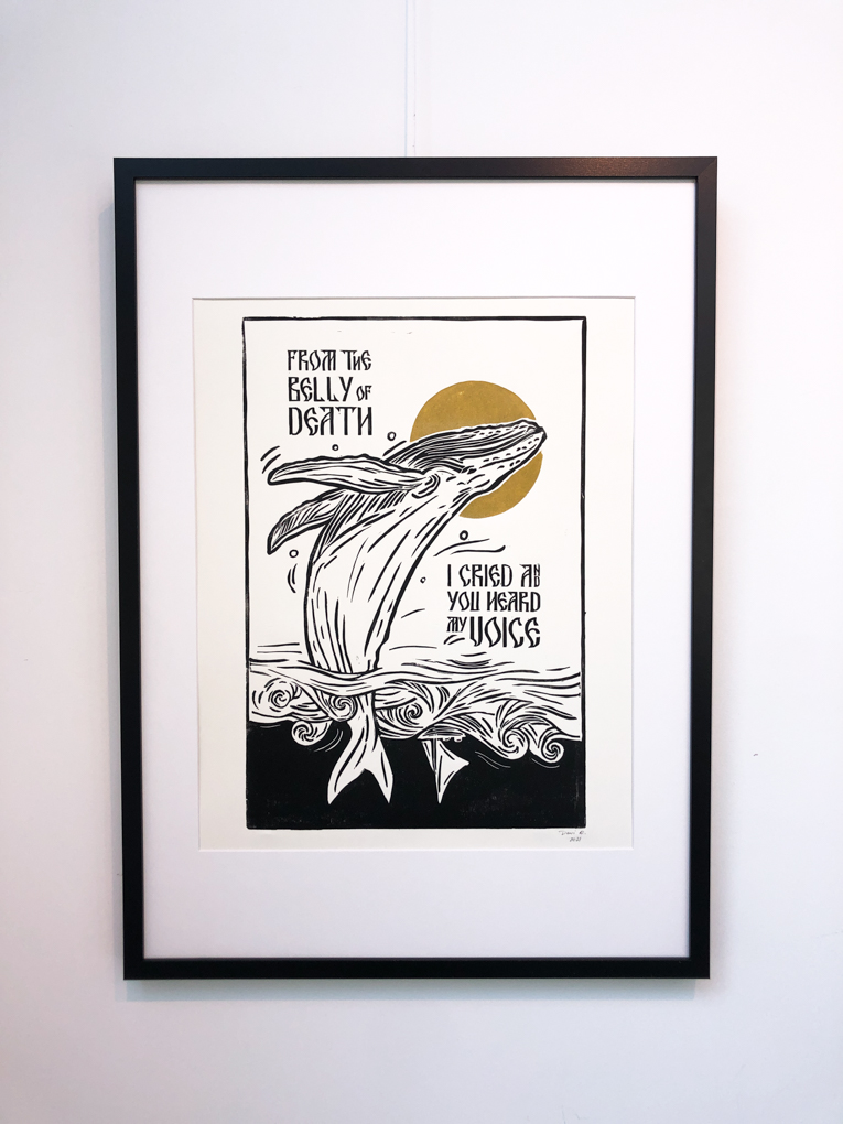 The print I made a month ago after saying goodbye to a very dear friend. He passed away after a long battle against cancer. Inspired by his favorite song during this period (Oceans – Hillsong) and Isaiah 43, this was a mere attempt to express some of the emotions, sorrows, and hopes in face of that tragic reality. It reveals a God wounded by the human experience, that reaches out and offers grace and salvation amid turmoil.